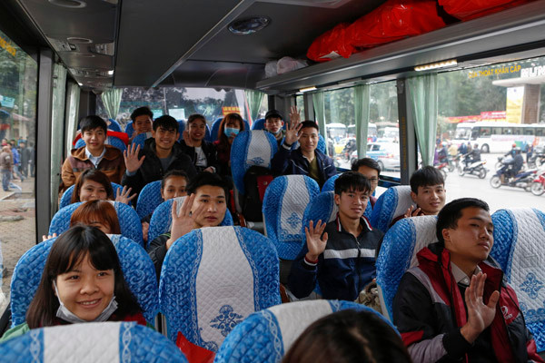 Các bạn sinh viên vui vẻ bên những chuyến xe miễn phí về quê đón Tết.