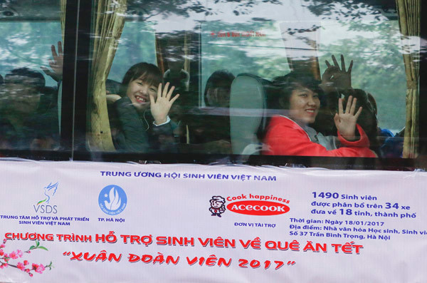Chương trình Hỗ trợ sinh viên về quê ăn Tết “Xuân Đoàn viên” năm 2017 cho gần 1.490 sinh viên với 34 chuyến xe từ Hà Nội về 18 tỉnh, thành ở khu vực phía Bắc và Bắc Trung Bộ, trải dài từ tỉnh Hà Giang đến tỉnh Quảng Bình (Hà Giang; Tuyên Quang; Hòa Bình - Sơn La - Điện Biên- Lai Châu; Thái Nguyên - Bắc Kạn - Cao Bằng; Yên Bái - Lào Cai; Hà Nam - Nam Định; Lạng Sơn; Thanh Hóa; Nghệ An; Hà Tĩnh; Quảng Bình). Trong sáng ngày 18/1/2016, cùng với điểm tổ chức Chương trình tại Nhà Văn hóa Học Sinh Sinh viên thành phố Hà Nội, các chuyến xe tại các điểm trường Đại học Lâm nghiệp và Học viện Nông nghiệp Việt Nam cũng xuất phát đưa sinh viên về quê sum vầy cùng gia đình. Ngoài hỗ trợ miễn phí các chuyến xe về địa phương, đến với chương trình các bạn sinh viên còn được Ban Tổ chức trao tặng phong bao lì xì, một thùng mỳ tôm của Cty Cổ phần Acecook.