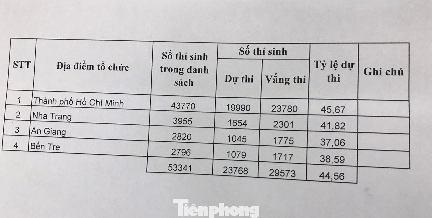 Trong đó, tỉ lệ vắng thi ở cụm thi TPHCM cũng dẫn đầu với 23.780 vắng thí trong tổng số 43.770 em đăng ký (tỉ lệ 45,67%). Tiếp đó là Nha Trang với 41,82%; Bến Tre là 38,59% và An Giang là 37,06%.
