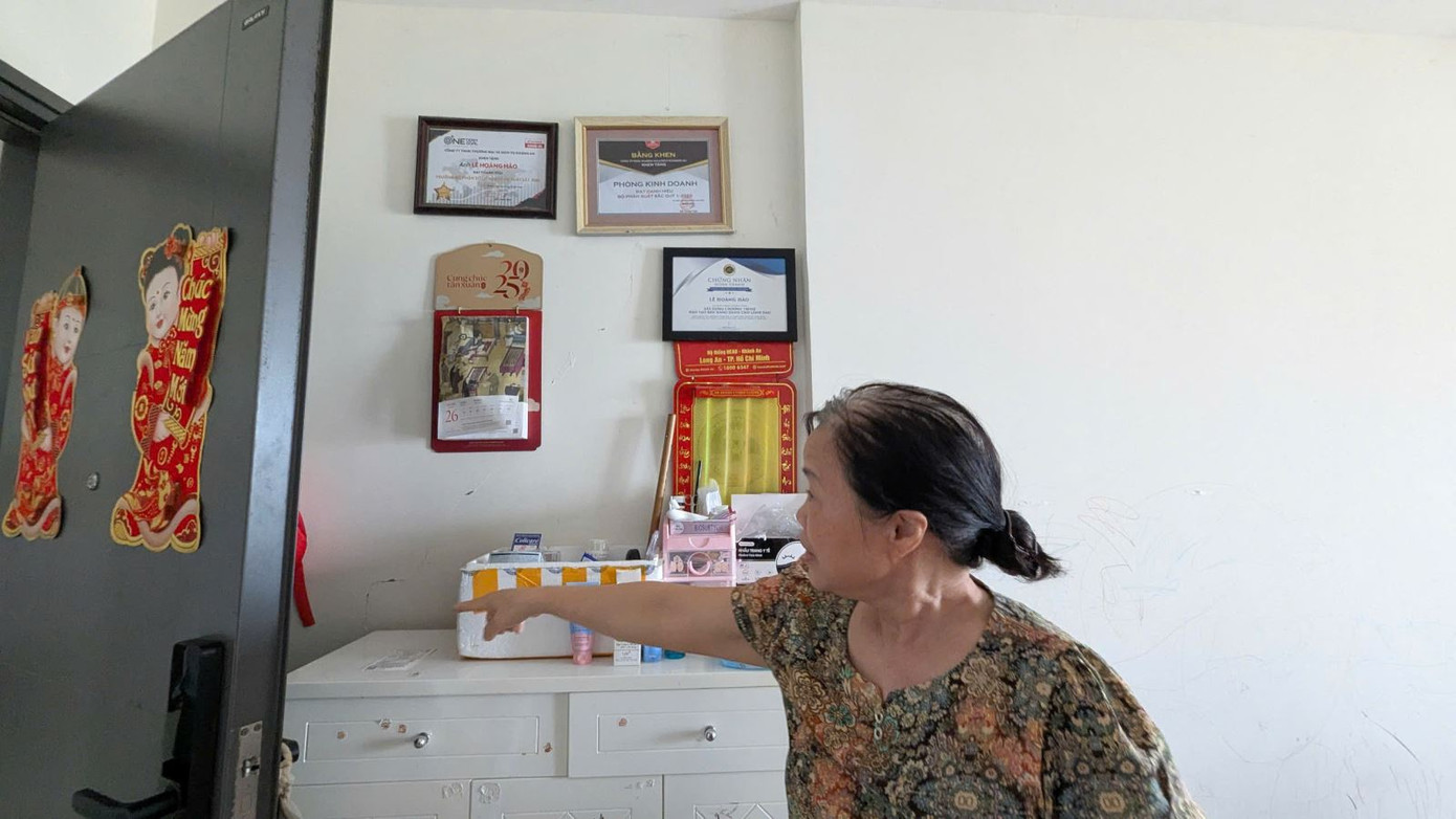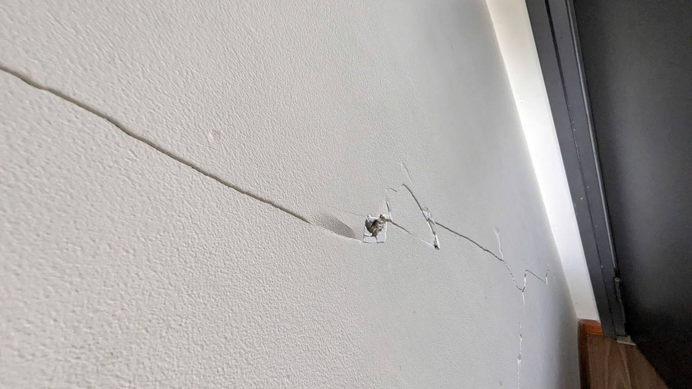 Sau sự cố, căn hộ của bà Hiền xuất hiện 4 vết rạn nứt tường, trong đó một vết dài hơn 1m ở phòng khách, hai vết nứt khác ở phòng ngủ và khu giếng trời. Bà khẳng định từ khi dọn về đây sống vào năm 2021, căn hộ chưa từng có dấu hiệu nứt hay hư hại.