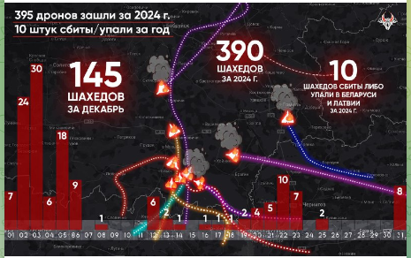 Belaruski Hajun, một kênh truyền thông giám sát quân sự độc lập của Belarus, trong một bài viết trên Telegram cho biết, tổng cộng có 395 máy bay không người lái (UAV) Nga bay vào không phận Belarus trong năm 2024. Những máy bay không người lái của Nga đã bay vào Belarus sau các cuộc tấn công tên lửa và UAV của lực lượng Nga nhằm vào mục tiêu quân sự trên lãnh thổ Ukraine.