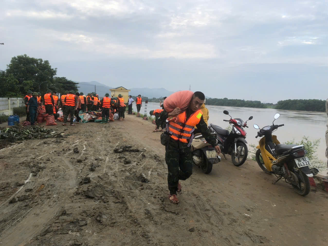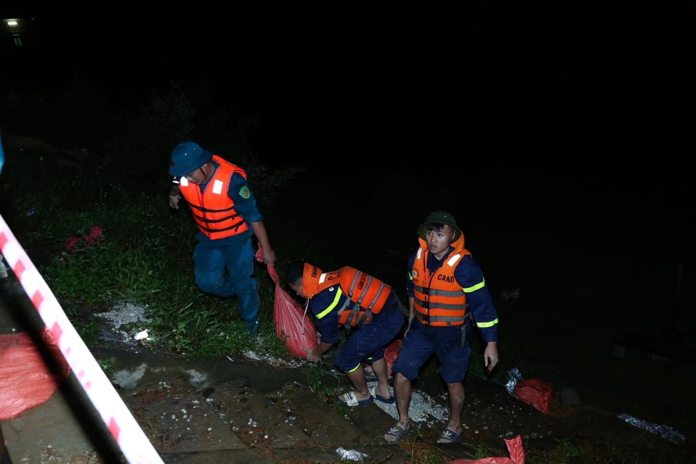 Theo đó, khoảng 500 người là dân quân tự vệ, quân sự, công an và người dân được huy động, xuyên đêm dùng bao cát, chèn đá hộc để xử lý khẩn cấp trên tuyến đê.