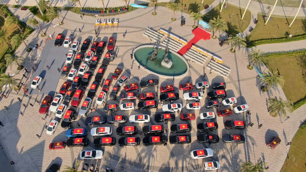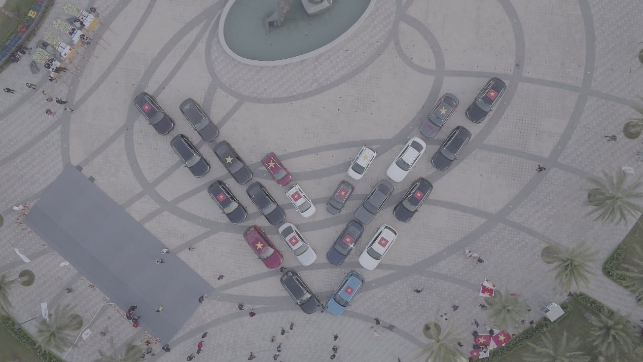 Những chiếc xe có mặt đầu tiên xếp thành hình chữ V khổng lồ, tạo một kỷ lục và biểu tượng cho "Vietnam", "Vingroup", "VinFast" và "Victory", đại diện cho tinh thần vươn ra biển lớn của người Việt.
