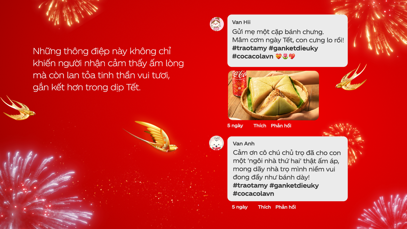 Với chiến dịch "Trao Tâm Ý, Gắn Kết Tết Diệu Kỳ", thương hiệu không chỉ tạo ra sân chơi giúp người trẻ chia sẻ tâm tư mà còn góp phần củng cố giá trị gia đình và cộng đồng, kết nối mọi thế hệ. Cùng quây quần bên mâm cơm đoàn viên, cụng ly Coca-Cola mát lạnh và chia sẻ niềm vui với gia đình là điều vốn đã là hình ảnh thân thuộc trong tâm trí người Việt vào mỗi dịp tết đến xuân về.