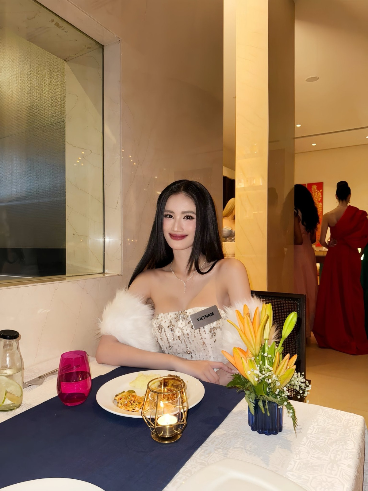 Tại các bữa tiệc tối, Ý Nhi tiếp tục chọn các thiết kế nổi bật và đa số là các mẫu váy dài ôm sát, khoe trọn hình thể thon gọn của nàng hậu: