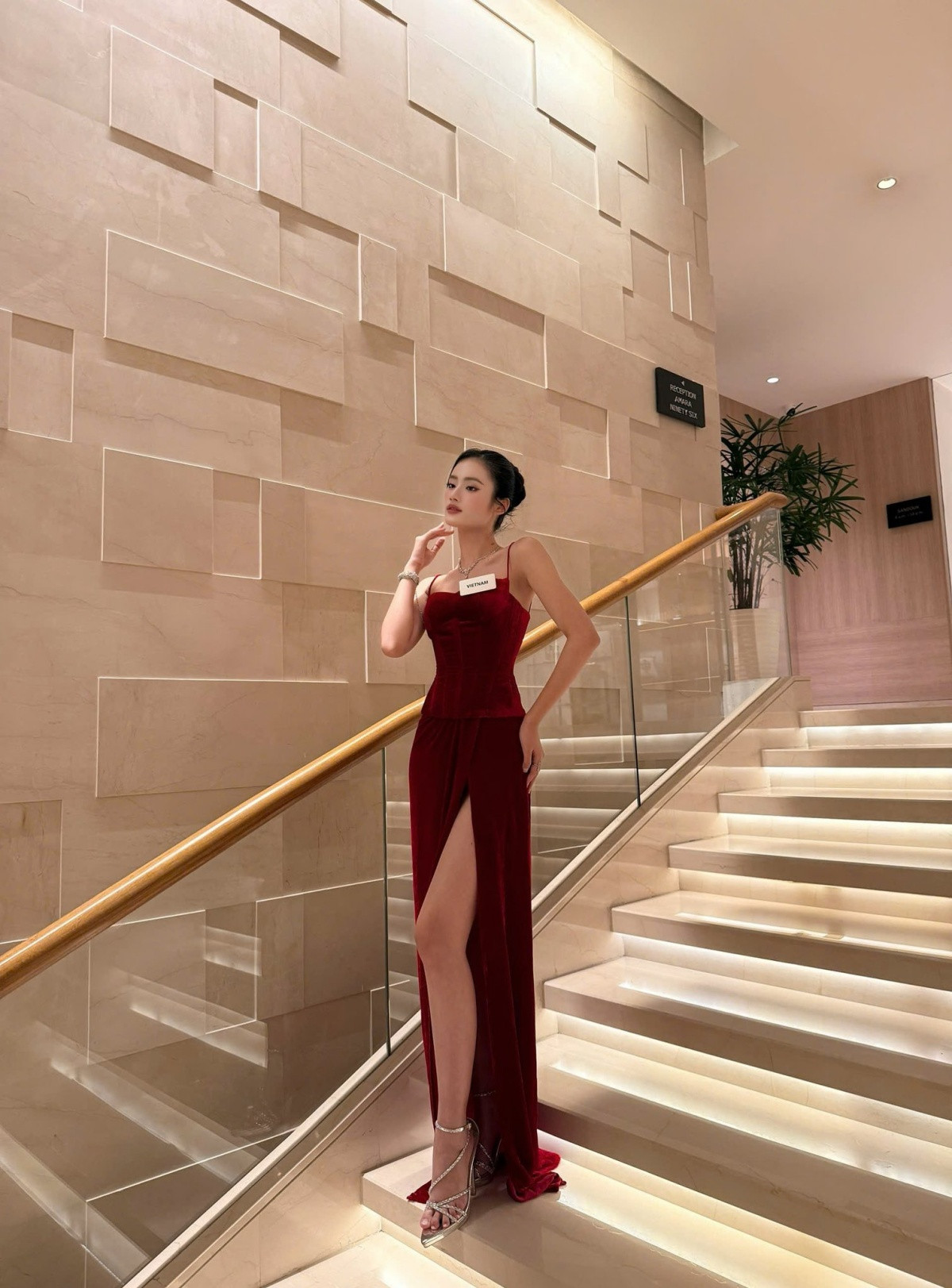 Trong bữa tiệc tối gần nhất, Ý Nhi mặc mẫu váy hai dây nhung đỏ, với phần thân trên ôm sát dạng corset, thân dưới xẻ tà, khéo léo khoe đôi chân dài.