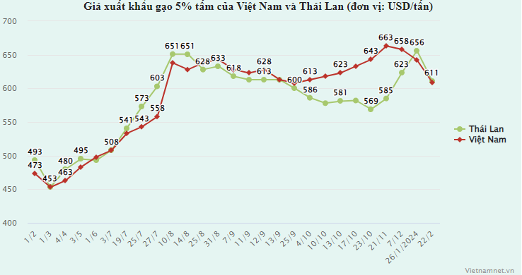 Theo dữ liệu từ Hiệp hội Lương thực Việt Nam (VFA), ngày 29/2, giá gạo 5% tấm xuất khẩu của nước ta giảm còn 594 USD/tấn, gạo 25% tấm giảm về ngưỡng 570 USD/tấn.
