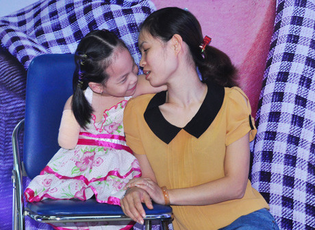 Không những thế, bên cạnh mẹ, em tỏ ra khá hiếu động và sử dụng phần cánh tay còn lại trêu vui mẹ nhưng cũng biết ngồi yên lắng nghe khi theo dõi mẹ trò chuyện với các cô chú xung quanh.