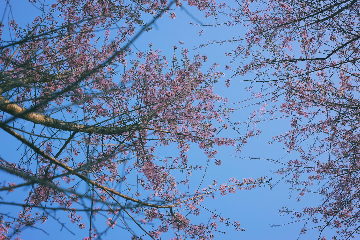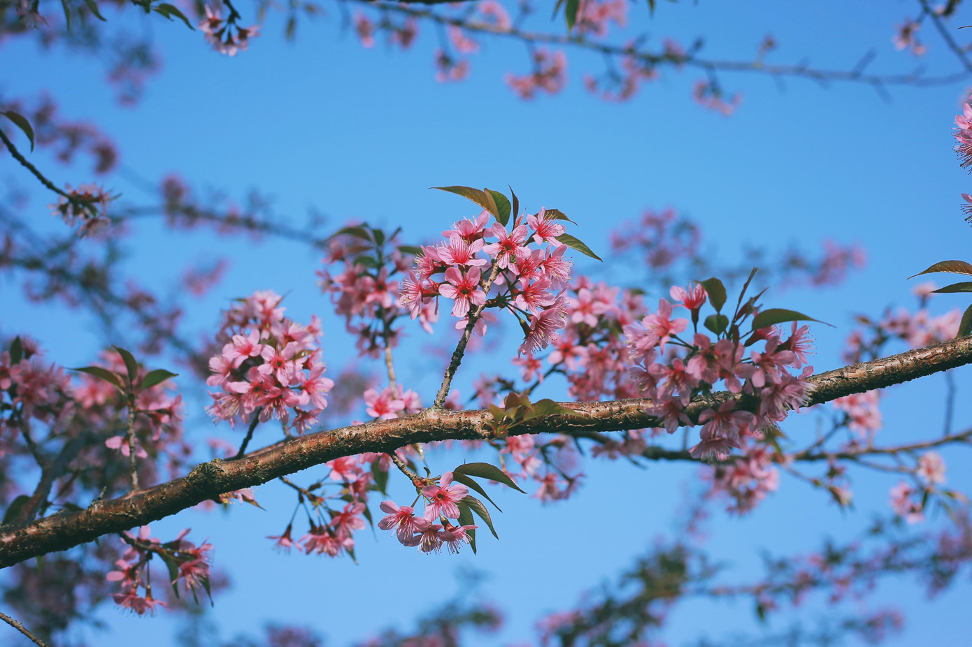 | Vẻ đẹp trắng muốt của hoa mơ Mộc Châu trên nền trời xanh qua góc máy của Kiên. |