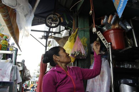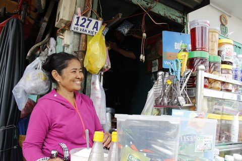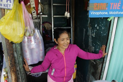 Lúc nào bà cũng nở nụ cười tươi rói trên mặt. "Nhà nhỏ xíu nhưng không phải đóng tiền nhà, chỉ đóng tiền điện thôi, buôn bán hằng ngày sống cũng quen rồi", bà Vân chia sẻ.