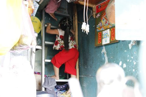Vì diện tích quá nhỏ nên để có chỗ ở cũng như để đồ đạc bà làm hai gác xép phía trên, dùng những tấm bạt che chắn để trú ngụ mưa nắng.