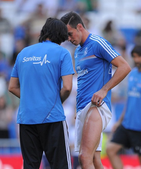 Trong buổi tập vào hôm thứ Hai, Gareth Bale đã để lộ bắp đùi cực khủng của mình với những miếng dán cơ có tác dụng thúc đẩy quá trình hồi phục. Kể từ hồi sang Real Madrid, Bale đã phải tập luyện rất nhiều để có cơ thể cuồn cuộn cơ bắp như bây giờ.