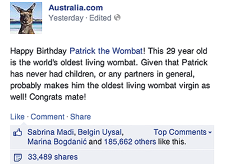 Patrick nặng 38kg, được cho là gấu túi lớn nhất thế giới. Patrick trở thành cơn sốt trên mạng xã hội Facebook sau khi trang Tourism Australia đăng lời chúc mừng sinh nhật Patrick (được 258.000 lượt thích trong vòng 24 giờ).
