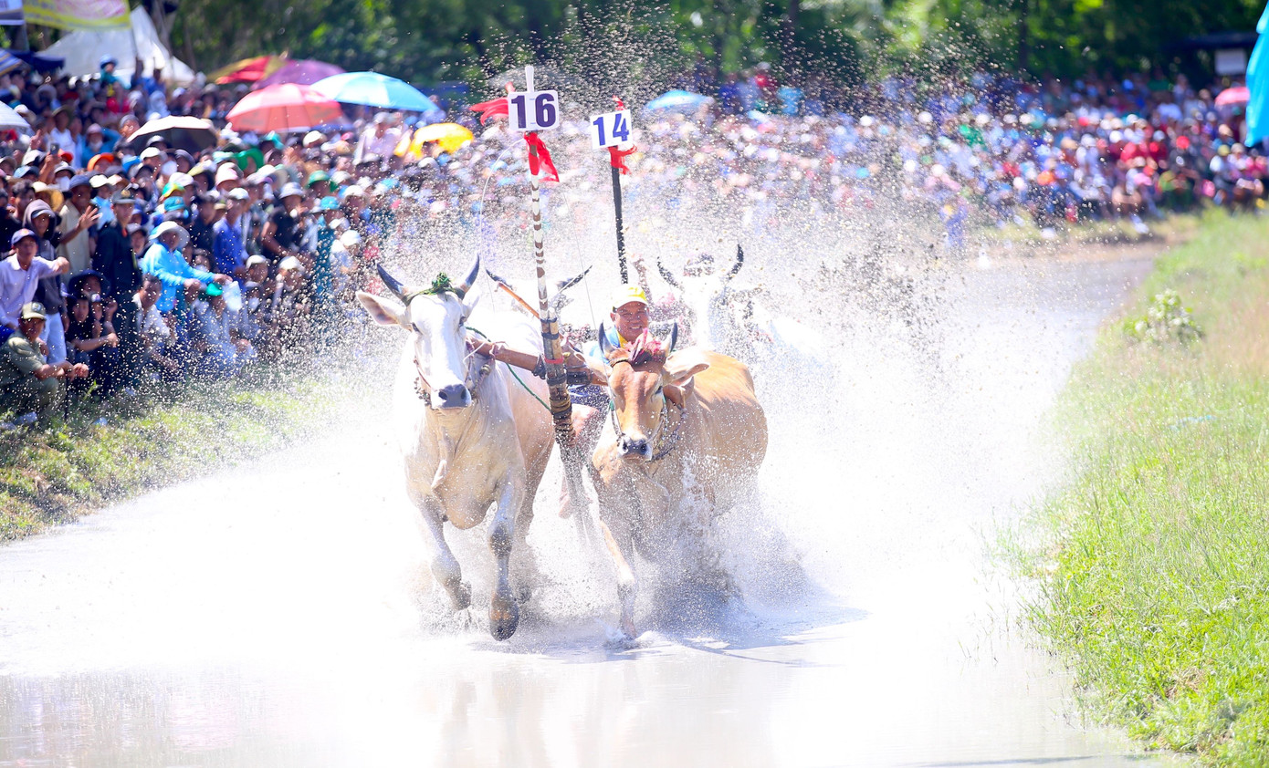 | Hội đua bò năm nay thu hút 64 đôi bò trong tỉnh An Giang và 2 đôi bò đến từ tỉnh Kiên Giang. Hầu hết các đôi bò trong cuộc thi lần này đến từ các địa phương có đồng bào dân tộc Khmer sinh sống. Mỗi đợt thi đấu có 2 đôi bò được bốc thăm ngẫu nhiên, tham gia thi đấu theo thể thức loại trực tiếp, chọn đội thắng cuộc vào vòng trong. Ảnh: Nhật Huy. |