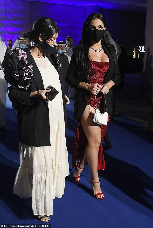 Georgina Rodriguez diện đầm đỏ hai dây xẻ cao khoe dáng nóng bỏng ngực đầy gợi cảm.