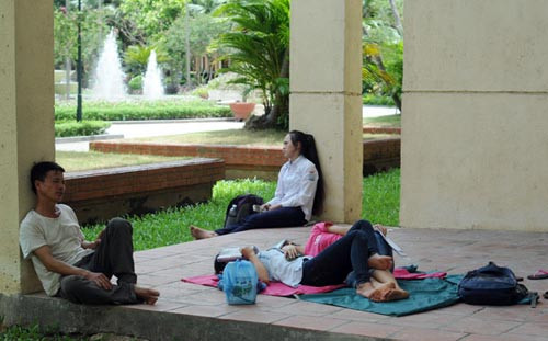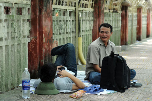 Ông Nguyễn Văn Bảo (50 tuổi, Quảng Xương, Thanh Hoá) đưa con trai út thi ĐH Thuỷ Lợi. Hai bố con ở nhờ nhà người quen ở phố Huế, xa trường nên hai bố nghỉ tạm ở vườn hoa gần trường lợi để đợi đến giờ thi
