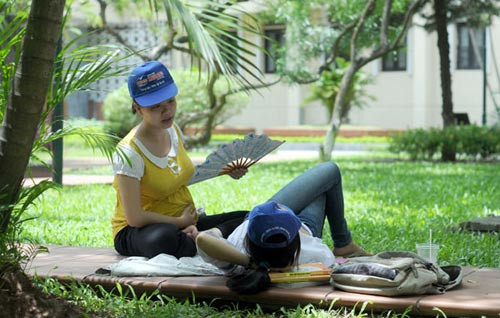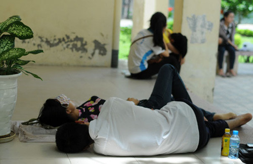 Hai mẹ con ngủ trưa ở trường ĐH Ngoại ngữ