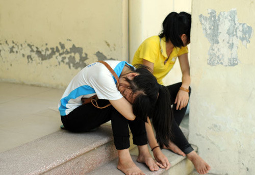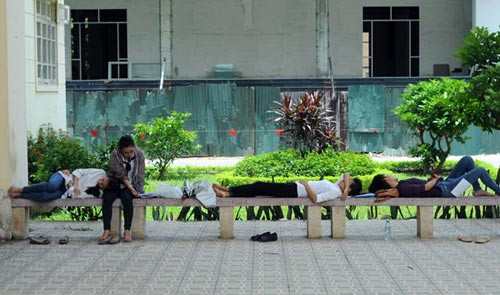 Mệt mỏi sau một buổi sáng thức dậy sớm, các sĩ tử ngủ thành hàng dài ở hành lang ĐH Ngoại ngữ (Hà Nội)
