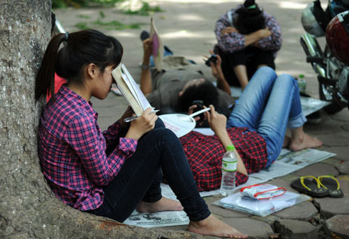 Sĩ tử vừa tranh thủ ôn bài, vừa ngủ gật