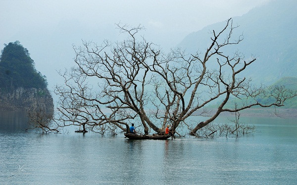 Con thuyền thanh thản giữa lặng thinh của không gian, chúng tôi trôi đi như mộng. Thi thoảng giật mình khi gặp những vách dựng đứng, những "cọc vài" (tiếng Tày, nghĩa là cọc buộc trâu) đá vôi sừng sững đâm lên từ giữa hồ, hay thốt lên ngỡ ngàng vì tán cây thay lá màu lá trên vách núi nàng tiên, nơi ánh mặt trời hắt những tia nắng mong manh như lụa.