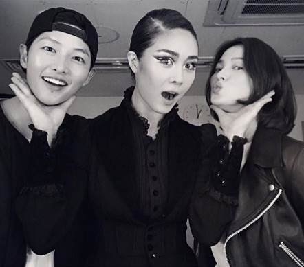 Tối qua, trên trang cá nhân của nữ ca sĩ Ock Joo Hyun đã đăng tải bức hình cô chụp cùng Song Joong Ki và Song Hye Kyo. Cặp đôi cùng diện đồ đen, tạo dáng nhí nhảnh.
