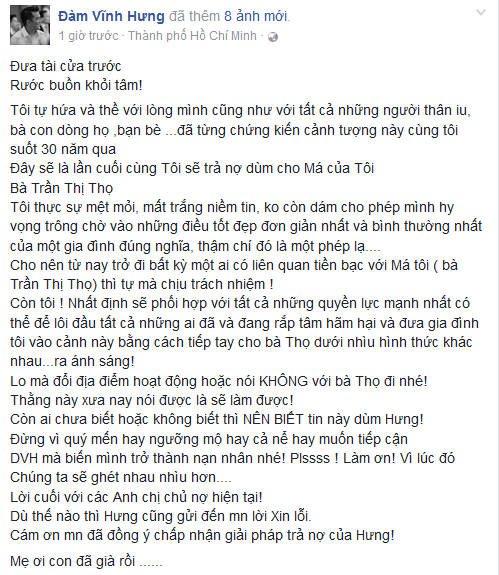 Còn tôi, nhất định sẽ phối hợp với tất cả những quyền lực mạnh nhất có thể để lôi đầu tất cả những ai đã và đang rắp tâm hãm hại và đưa gia đình tôi vào cảnh này bằng cách tiếp tay cho bà Thọ dưới nhiều hình thức khác nhau... ra ánh sáng! Lo mà đổi địa điểm hoạt động hoặc nói không với bà Thọ đi nhé! Thằng này xưa nay nói được là sẽ làm được! Còn ai chưa biết hoặc không biết thì nên biết tin này giùm Hưng! Đừng vì quý mến hay ngưỡng mộ hay cả nể hay muốn tiếp cận Đàm Vĩnh Hưng mà biến mình trở thành nạn nhân nhé! Làm ơn! Vì lúc đó chúng ta sẽ ghét nhau nhiều hơn... Lời cuối với các anh chị chủ nợ hiện tại. Dù thế nào thì Hưng cũng gửi đến mọi người lời Xin lỗi. Cám ơn mọi người đã đồng ý chấp nhận giải pháp trả nợ của Hưng. Mẹ ơi con đã già rồi”.