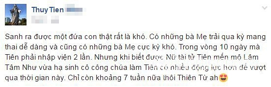 Thủy Tiên viết: "Sanh ra được một đứa con thật rất là khó. Có những bà Mẹ trải qua kỳ mang thai dễ dàng và cũng có những bà Mẹ cực kỳ khó. Trong vòng 10 ngày mà Tiên phải nhập viện 2 lần. Nhưng khi biết được nữ tài tử Tiên mến mộ Lâm Tâm Như vừa hạ sinh cô công chúa làm Tiên có nhiều động lực hơn để vượt qua thời gian này. Chỉ còn khoảng 7 tuần nữa thôi Thiên Từ à! Xin được chúc mừng gia đình Lâm Tâm Như".