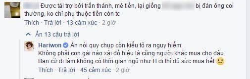 Đáp lại, Hari Won thẳng thắn lên tiếng: “Ăn nói quy chụp còn kiểu tỏ ra nguy hiểm. Không phải con gái nào xài đồ hiệu là cũng người khác mua cho đâu. Bạn cứ đi làm không có thời gian ngủ như Hari đi thì đủ sức mua hết”.