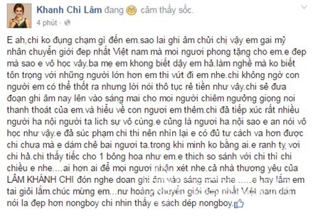 Trên trang cá nhân, Lâm Chi Khanh bức xúc viết: "Em đã xúc phạm chị thì nên nhìn lại em có đủ tư cách và hơn được chị chưa mà em dám chê người ta trong khi mình thì không bằng ai? Em ganh tỵ với chị hả? Chị thấy tiếc cho một bông hoa như em. Em thích so sánh với chị thì chị chiều em nhé. Ai hơn ai để mọi người nhận xét nhé... Em hay lắm, em tài giỏi lắm. Chúc mừng em. Nữ hoàng chuyển giới đẹp nhất Việt Nam, dám nói là đẹp hơn Nong Poy. Chị nhìn thấy em xách dép cho Nong Poy".