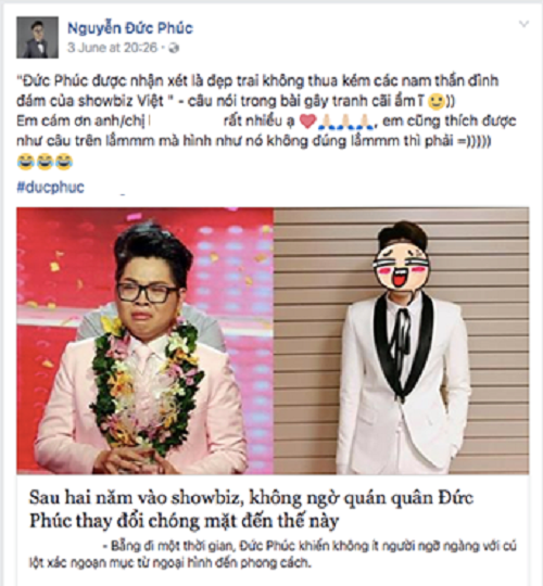 Nam ca sĩ cho biết sắp tham gia vào một chương trình PTTM, “mình không muốn đến khi đó quý vị khán giả và fan mới biết, lúc đó chắc chắn sẽ rất nhiều thắc mắc và câu hỏi tại sao, chính vì vậy mình đã viết những dòng tâm sự này để thông báo cũng như thể hiện sự tôn trọng đối với khán giả đã yêu mến mình từ giọng hát đến ngoại hình của mình trước đây", Đức Phúc viết.