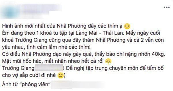 Theo thông tin từ fanpage tải bức ảnh, Nhã Phương hiện tham gia một khóa tu tập ngắn ngày tại Thái Lan và Trường Giang thường đến thăm bạn gái và chuyện tình cảm của hai người được cho vẫn tốt đẹp sau những sóng gió.