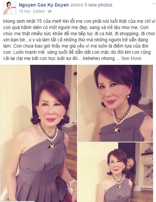 Khoảng 2 năm trước, MC Nguyễn Cao Kỳ Duyên chia sẻ hình ảnh cô và mẹ đang diện áo tắm phơi nắng trên phi thuyền. Lúc đó, bà Đặng Tuyết Mai đã 73 tuổi nhưng vẫn giữ được làn da mịn màng và nét tươi trẻ cùng với thân hình gợi cảm.