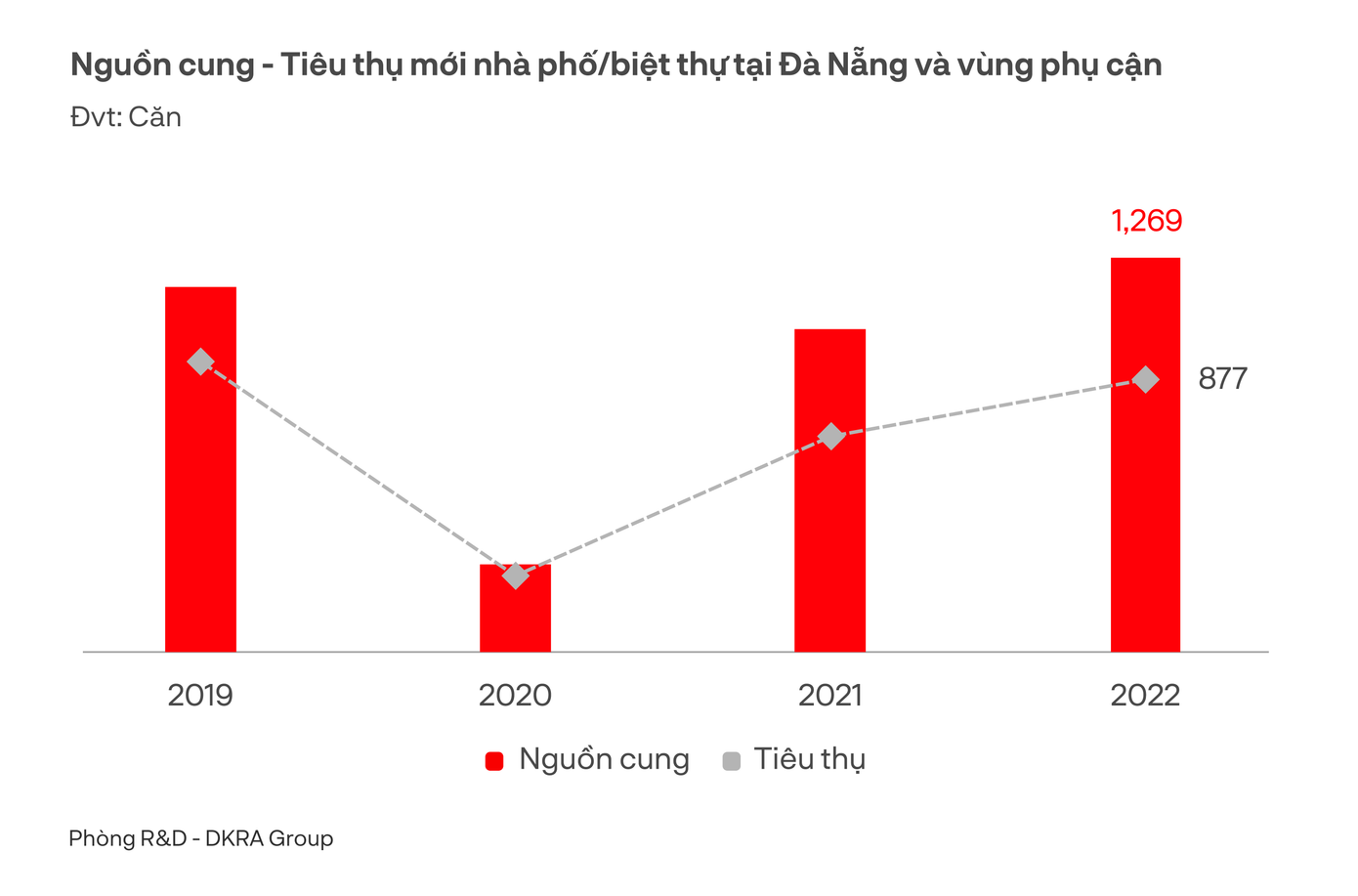 Nguồn cung mới nhà phố, biệt thự khu vực Đà Nẵng và vùng phụ cận ghi nhận tăng so với năm 2021. Trong năm 2022, thị trường đón nhận 1.269 căn nhà phố, biệt thự đến từ 10 dự án, tăng 22% so với năm ngoái. Tuy nhiên chỉ tập trung cục bộ tại một số dự án quy mô lớn trong khu vực và phân bổ chủ yếu trong giai đoạn 6 tháng đầu năm. Tỷ lệ tiêu thụ đạt 69% tương đương 877 căn, tăng 27% so với năm 2021. Mặt bằng giá sơ cấp tiếp tục duy trì đà tăng, dao động từ 18 - 20% so với cùng kỳ do chi phí đầu vào, lạm phát, lãi suất tăng cao. Ở thị trường thứ cấp, thanh khoản ở mức thấp và gần như không phát sinh giao dịch.