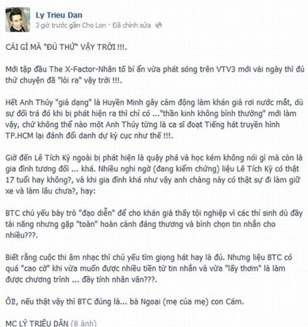 Từ câu chuyện này có thể thấy được gia đình không phải là giàu có của Tích Kỳ và một câu bé mới 17 tuổi đã phải bươn chải kiếm sống khiến nhiều người rơi lệ. Tuy nhiên mới đây trên trang cá nhân của MC Lý Triệu Dân đã bàn luận đến câu chuyện của Lê Tích Kỳ với những câu hỏi liệu anh chàng có phải 17 tuổi hay không và gia cảnh này đâu có phải đáng thương mà ban tổ chức lại "đạo diễn" một hoàn cảnh như vậy để lấy lòng khán giả?