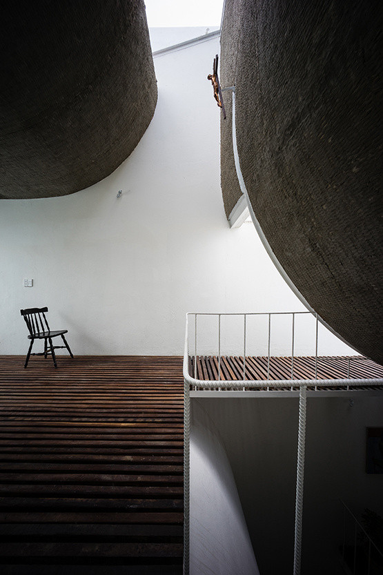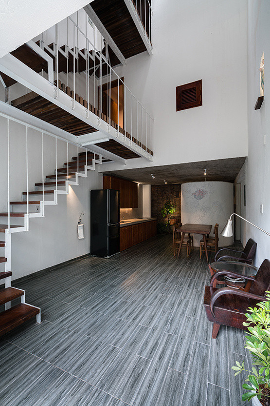 Để thông gió tối đa, trong nhà có một khoảng thông tầng lớn. Đây cũng là một giải pháp dự trù cho những biến động trong tương lai: khi gia đình có thêm thành viên, cần thêm các nhu cầu vật chất, có thể lắp thêm sàn gỗ để tăng diện tích sinh hoạt.