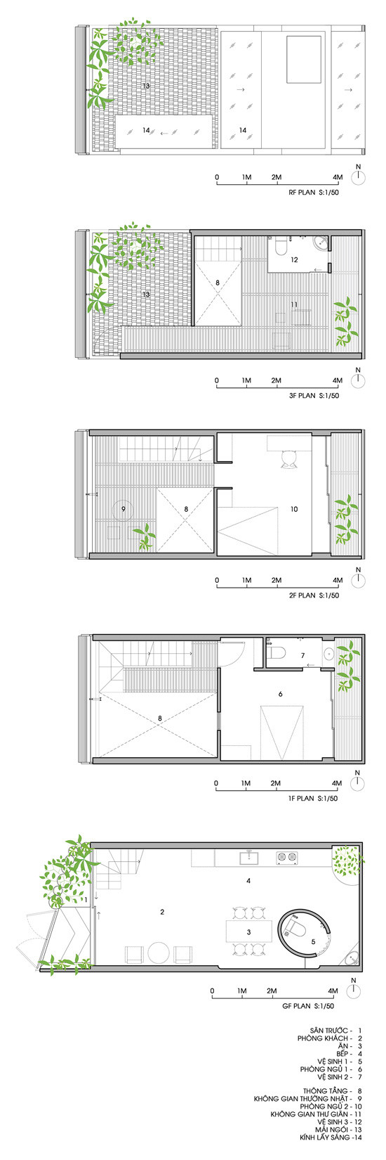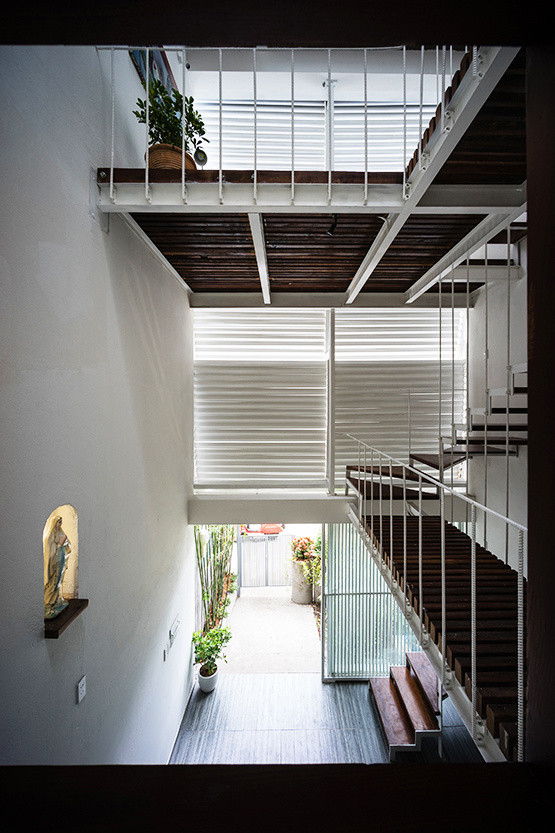 Sàn gỗ rỗng với những thanh gỗ xếp như một hệ lam, cầu thang bậc rỗng, lan can làm bằng thép mảnh, tất cả đều góp phần giúp thông gió tự nhiên và tăng cường giao tiếp giữa các thành viên gia đình.