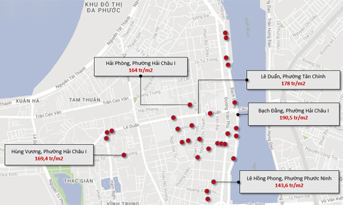 Lô 121 Phan Châu Trinh có giá đất mặt tiền 107,3 triệu đồng mỗi m2, 106 Trần Phú 113,78 triệu đồng mỗi m2, 107 Hoàng Hoa Thám 122,4 triệu đồng mỗi m2, 22 Cô Giang 127,1 triệu đồng mỗi m2, 11 Phạm Hồng Thái 129,6 triệu đồng mỗi m2, 34 Hoàng Văn Thụ 130,5 triệu đồng mỗi m2, 82 Trần Quốc Toản 130,8 triệu đồng mỗi m2.