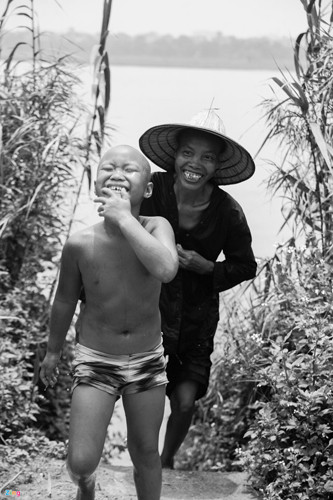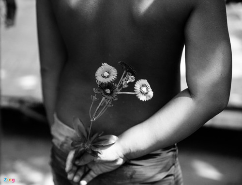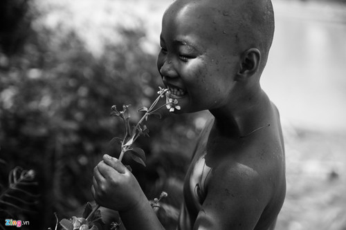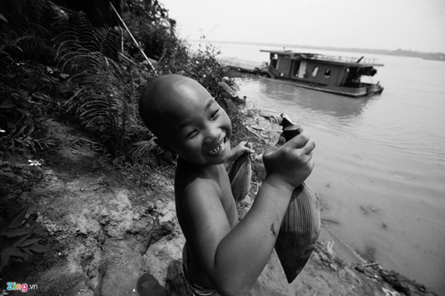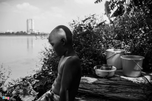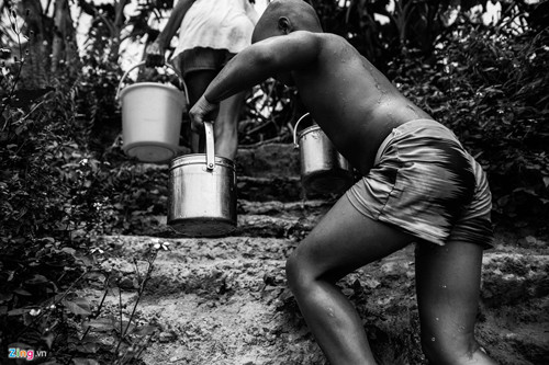 Hàng ngày, cô bé 7 tuổi đi lấy nước từ dưới sông Hồng lên cho mẹ nấu nướng, rửa rau, vo gạo.