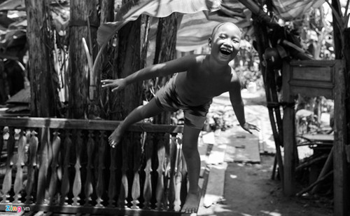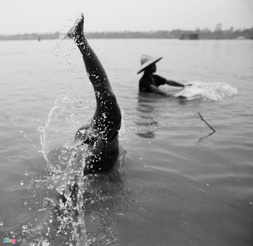 Bé Hạnh nhảy xuống sông vùng vẫy trong khi mẹ giặt quần áo. Hàng ngày cứ mỗi khi nóng cả nhà đều được bơi lội thỏa thích.