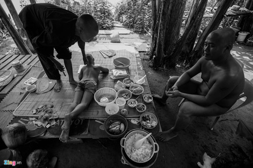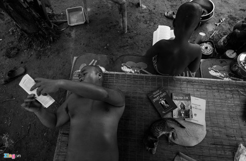 Người đàn ông sinh năm 1974, bất chấp việc con gái mình đã lớn, vẫn tồng ngồng trước mặt bé. Trong ảnh, bố nằm đọc sách trong khi con gái ngồi bên. Từ sáng tới khuya, anh Nghĩa thường nghiên cứu các cuốn nói về đạo Phật.