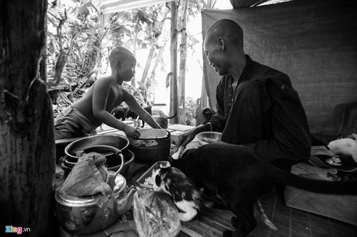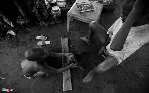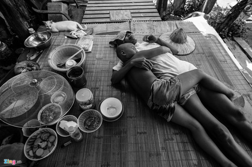 Cả gia đình sinh hoạt không có giờ giấc, đói là ăn, muốn ngủ là ngủ ở bất cứ lúc nào. "Hay bị các côn trùng đốt lắm nhưng ở lâu thành quen", chị Mùi cho biết.