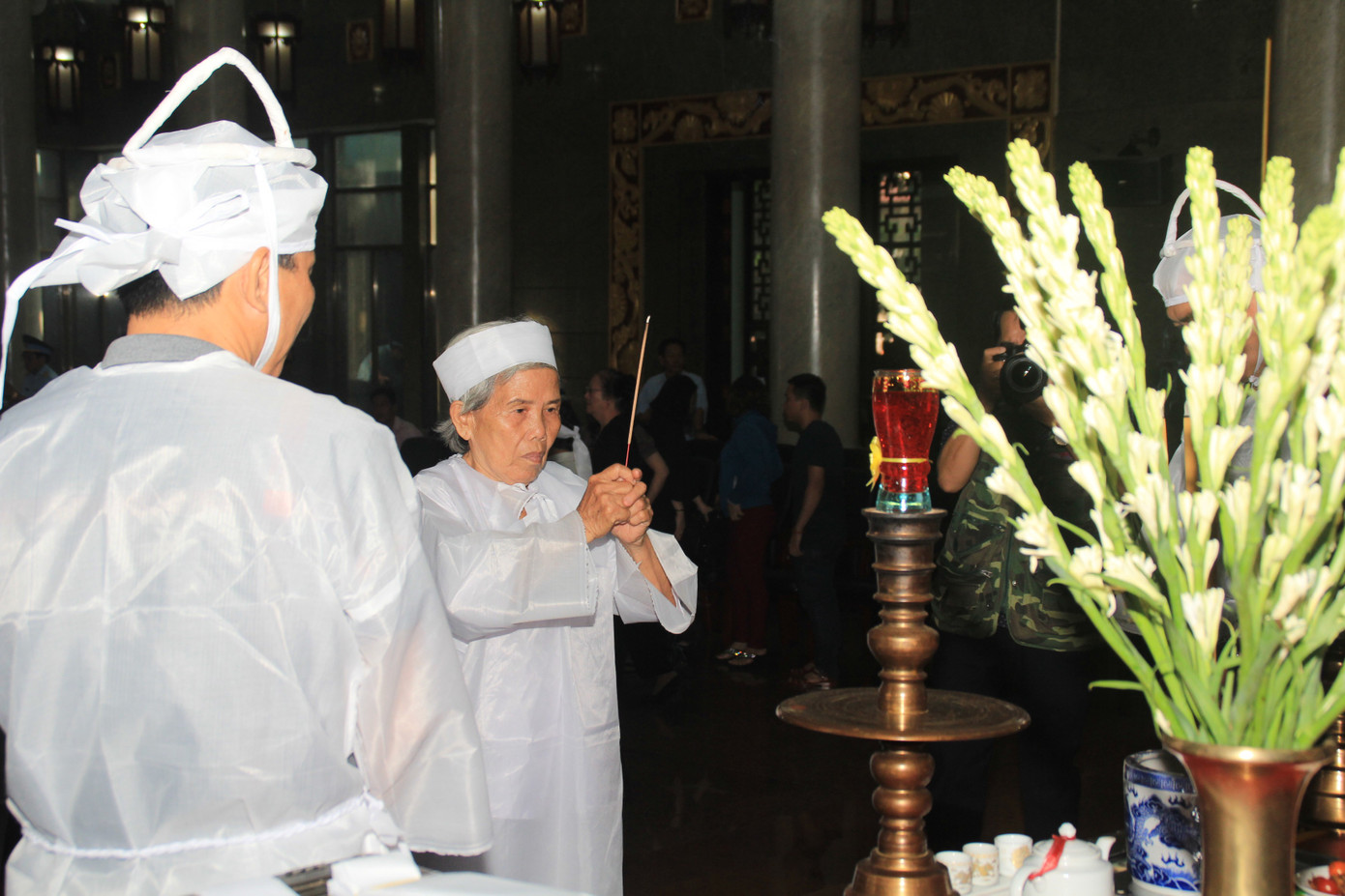 Vợ của Đại tá, Anh hùng lực lượng vũ trang nhân dân Nguyễn Văn Bảy thắp nén trước ban thờ.