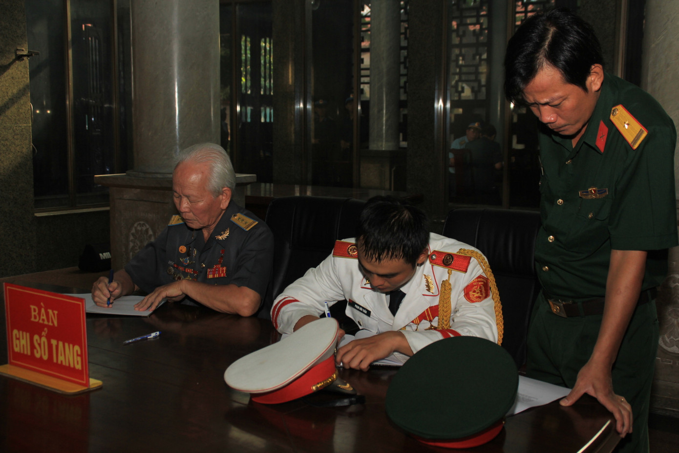 Các đồng chí, đồng đội ghi sổ tang viếng Đại tá, Anh hùng lực lượng vũ trang nhân dân Nguyễn Văn Bảy