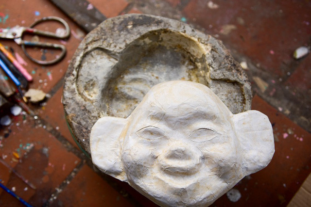 Để làm một chiếc mặt nạ giấy bồi, trước tiên phải xé giấy thật nhỏ, sau đó lót một lớp giấy trắng vào khuôn xi măng đúc sẵn. Lớp trước được dán chồng lên lớp sau, kết dính bằng một loại hồ đun chín từ bột sắn. Khoảng 5, 6 lớp giấy vụn sẽ làm ra một chiếc mặt nạ giấy bồi…