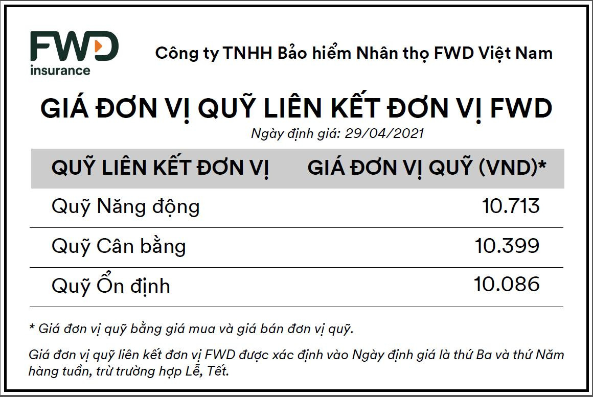 Giá đơn vị Quỹ liên kết đơn vị FWD theo ngày định giá 29/04/2021