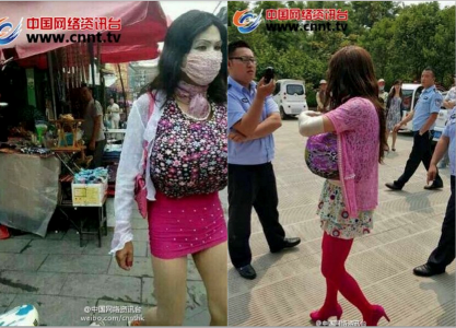 Khi cảnh sát đến hiện trường để kiểm tra, phát hiện một người đàn ông cải trang giả gái. Người này mặc quần đỏ bó sát, váy ngắn, đi giày cao gót, trang điểm rất đậm và mang bộ ngực giả “khủng”.