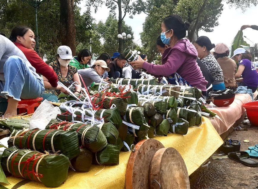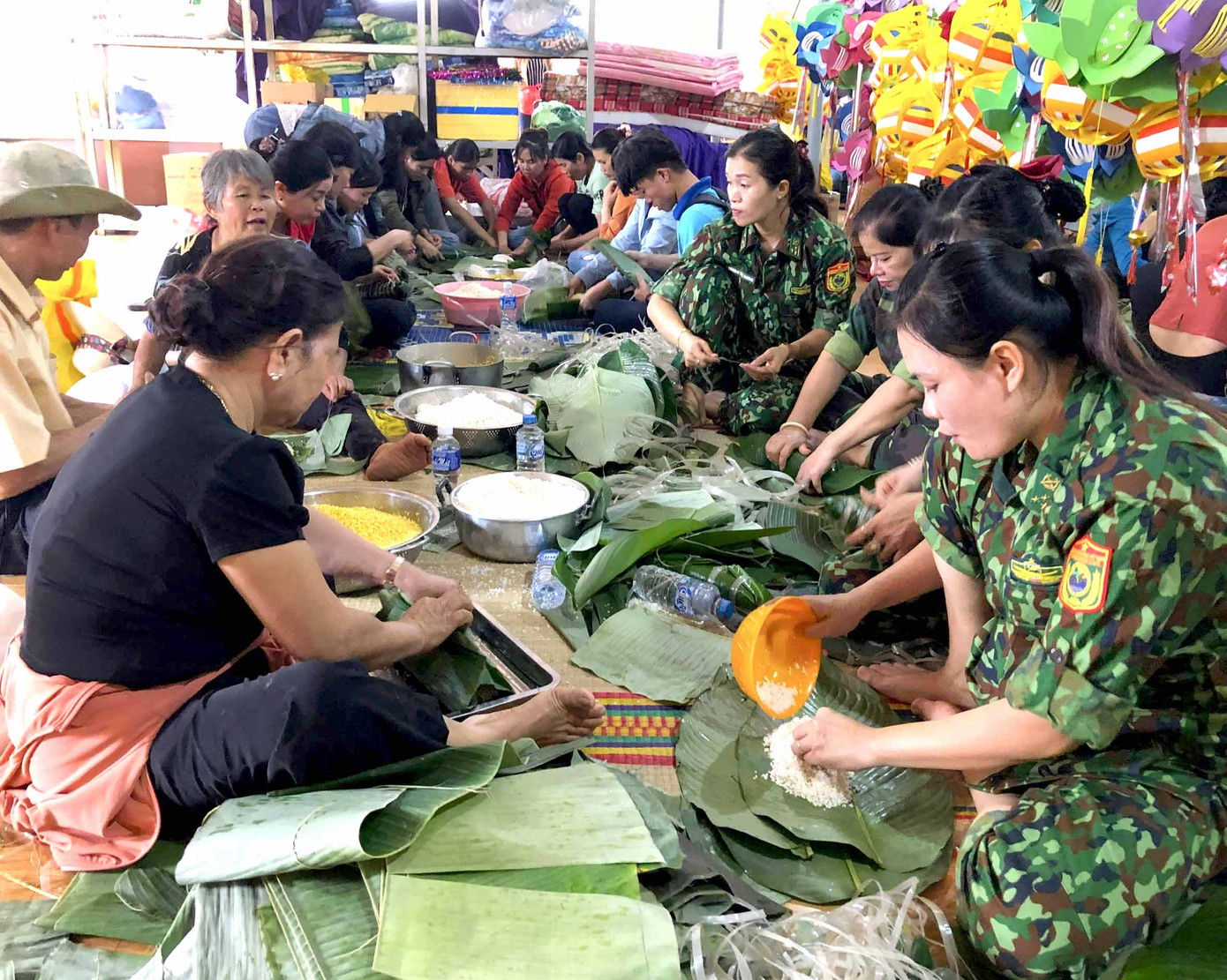 Hơn 200 người dân, chiến sĩ tập trung ở Tịnh xã Ngọc Nguyên (xã Trà Đa, TP Pleiku) để hoàn thành 4 nghìn chiếc bánh tét gửi về miền Trung