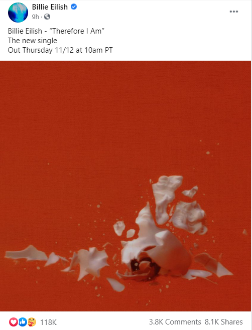 Billie Eilish chỉ hé lộ tên bài hát mới là Therefore I Am, cùng khung giờ phát hành chính thức lúc 10AM (PT) ngày 12/11 (tức 1 giờ sáng ngày 13/11, theo giờ Việt Nam).