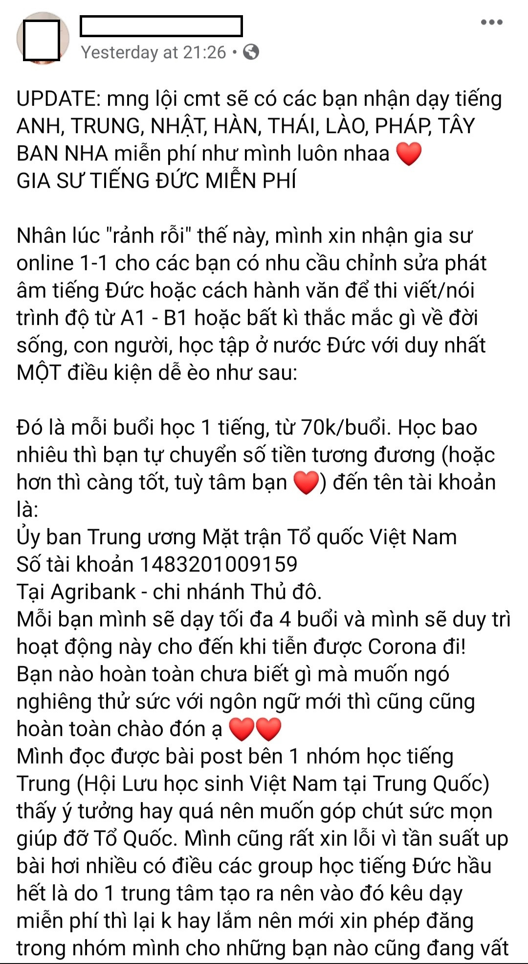 Dạy tiếng Anh online không còn xa lạ với nhiều người, nhưng với những ngôn ngữ khác như tiếng Đức, tiếng Pháp, tiếng Thái hay thậm chí là tiếng Trung, tiếng Nhật đều có mức học phí rất cao và khó tìm được người dạy. Các bạn trẻ này đã không ngần ngại bỏ công sức ra để vừa chia sẻ được kiến thức vừa quyên góp thêm cho đồng bào.