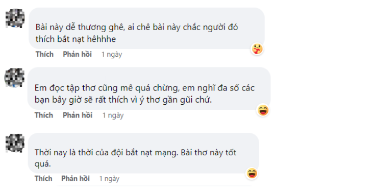 Dẫu vậy, cũng có những teen cho rằng đây là bài thơ thu hút và phù hợp với lứa tuổi teen. Bạn Phạm Nguyễn Quỳnh Như (Quận 7, TP.HCM) chia sẻ: “Mình thấy bài đọc vào sẽ nhớ liền, thông điệp cũng dễ thương. Bài nói về vấn đề bắt nạt thì lại càng phù hợp để khơi gợi nhận thức học sinh, đặc biệt là đề tài này rất hợp lý khi năm vừa rồi có nhiều vụ bắt nạt học đường xảy ra”.